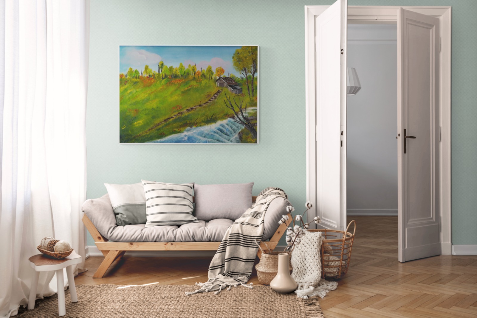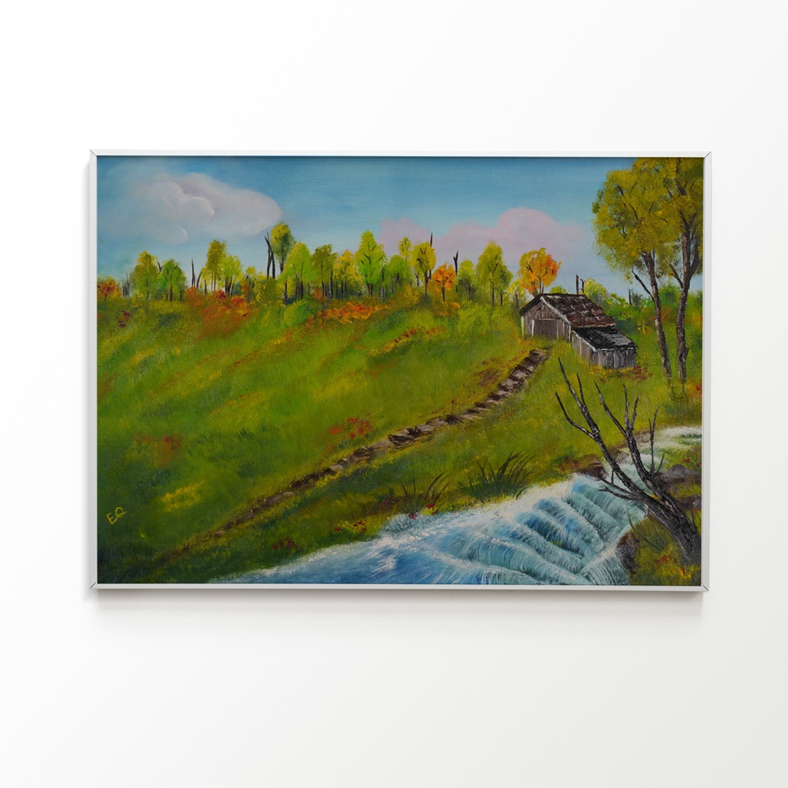 The art of landscape painting has long been celebrated for its ability to capture the beauty and serenity of nature. One such masterpiece is a landscape painting made of oil paint, a river with a house overlooking it and grass adorned with the vibrant autumn colors of trees in the far horizon. As one gazes upon this artwork, you’re immediately transported to a tranquil setting where time seems to stand still. The artist’s meticulous brushstrokes bring life to every element in the painting, from the gentle ripples on the surface of the river to the intricate details of each leaf on the trees. The focal point of this masterpiece is undoubtedly the house perched atop a hill, commanding an awe-inspiring view of the river below. Its warm hues blend harmoniously with its surroundings, creating a sense of unity between man-made structures and nature. It serves as a reminder that humans are not separate from nature but rather an integral part of it. The autumn colors that adorn the grass and trees evoke feelings of nostalgia and tranquility. The golden yellows, fiery oranges, and deep reds create a symphony of hues that dance across the canvas. They symbolize both beauty and impermanence – reminding us that change is inevitable but can also be breathtakingly beautiful. In conclusion, this landscape painting made with oil paints captures not only nature’s splendor but also our connection to it. Through its meticulous details and vibrant colors, it invites viewers to appreciate both man-made structures and natural elements as one cohesive whole. It serves as a timeless reminder that amidst life’s constant changes, there is always beauty to be found in our surroundings.