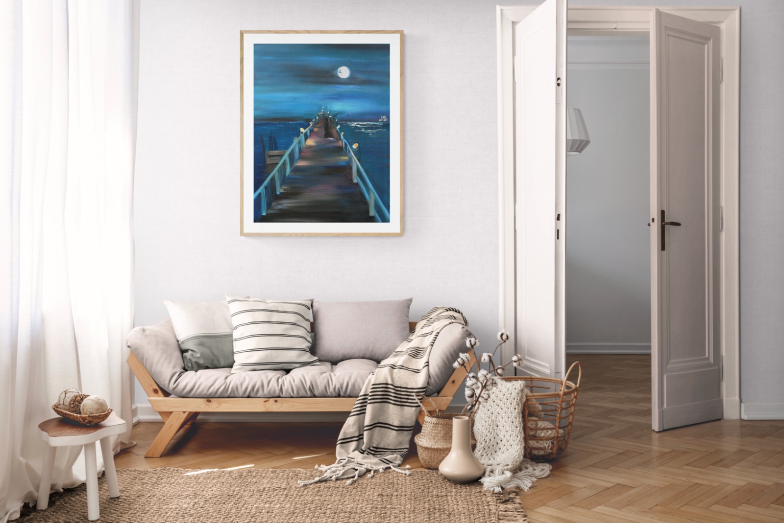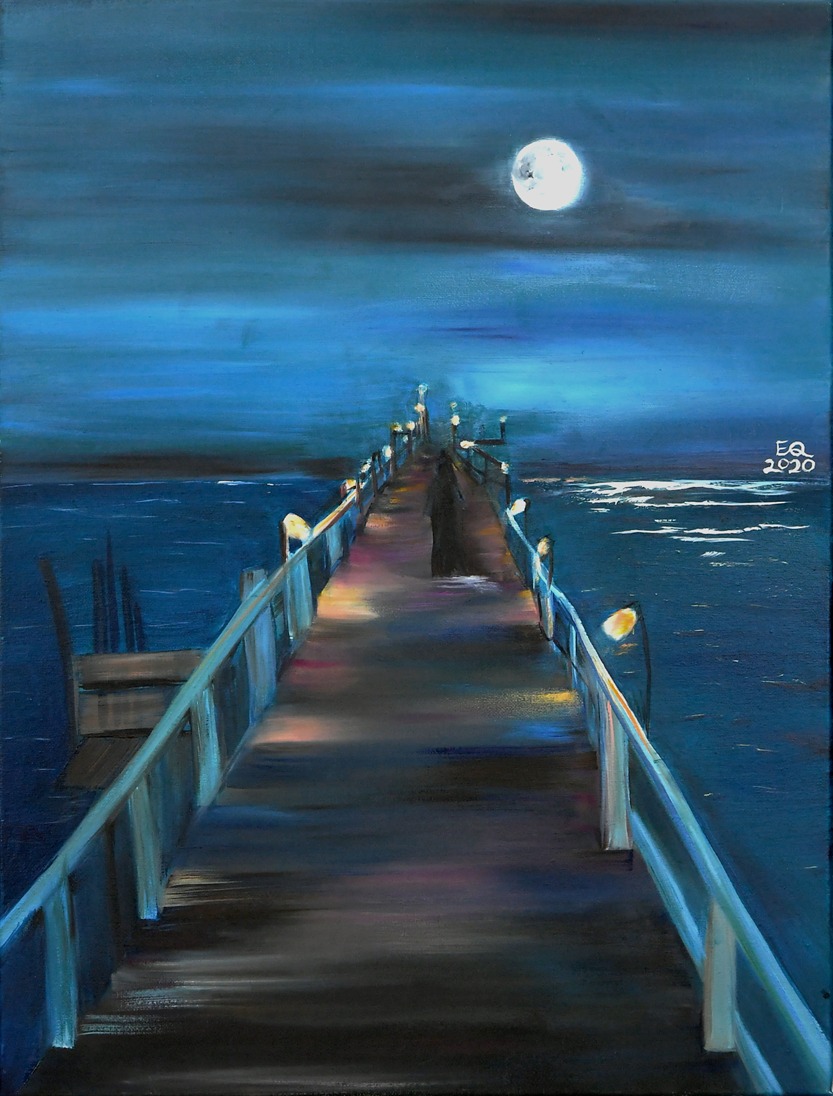 The dark shadowing in the painting adds an air of intrigue as if something hidden or unknown lies beyond the pier. The artist’s choice to emphasize these shadows creates a sense of anticipation, drawing the viewer’s eye toward the woman walking toward the end of the pier. It is as if she is on a journey into the unknown, symbolizing human curiosity and our innate desire to explore.
