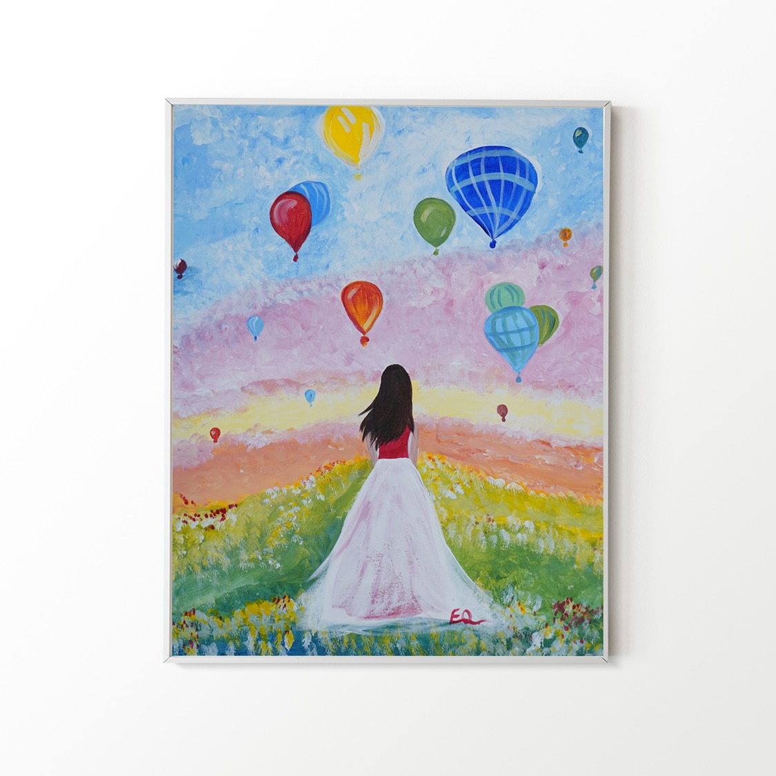 This acrylic painting captures a moment frozen in time – a young girl mesmerized by hot air balloons soaring amidst nature’s splendor. Its vibrant colors breathe life into an otherwise ordinary scene. Through its artistry and symbolism, it encourages viewers to embrace their sense of wonderment and appreciate the simple yet extraordinary moments that make life truly remarkable. The artist’s brushstrokes effortlessly capture the whimsical nature of hot air balloons as they dance through the skys. The girl’s presence reveals her awe and wonderment at this enchanting spectacle Her. eyes sparkle with delight as she witnesses these vibrant orbs suspended in mid-air. The use of vivid colors in this painting serves to evoke emotions within the viewer. The various hues symbolize different aspects of life – blue representing tranquility and freedom, green signifying growth and vitality, yellow embodying joy and optimism, pink denoting innocence and femininity, red symbolizing passion and energy, while orange represents enthusiasm and creativity. This masterpiece not only showcases artistic skill but also invites contemplation on themes such as adventure, exploration, and embracing one’s dreams. It reminds us to look beyond our immediate surroundings and seek inspiration from the beauty that surrounds us.