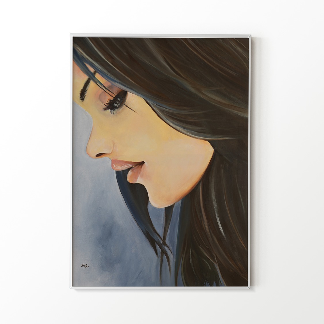 This captivating oil painting explores the essence of femininity. The artist utilizes soft brushstrokes to highlight the woman’s delicate features, imbuing her with an air of elegance. Her downcast eyes, shimmering with a hint of wonder, seem to hold untold stories. Perhaps she’s lost in contemplation, reflecting on past experiences. The intriguing composition draws the viewer in, inviting us to ponder what lies beyond her gaze and delve into introspection.
