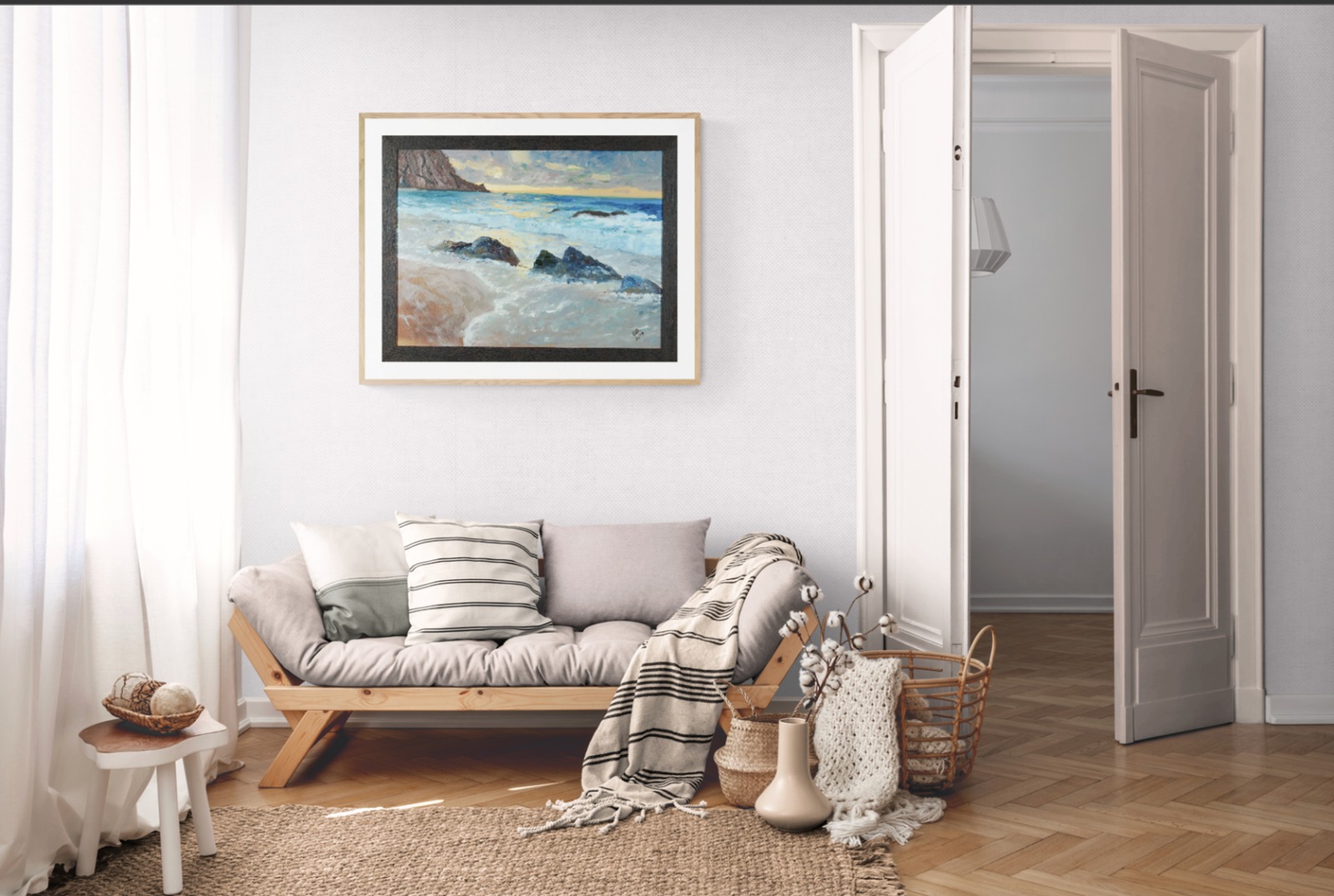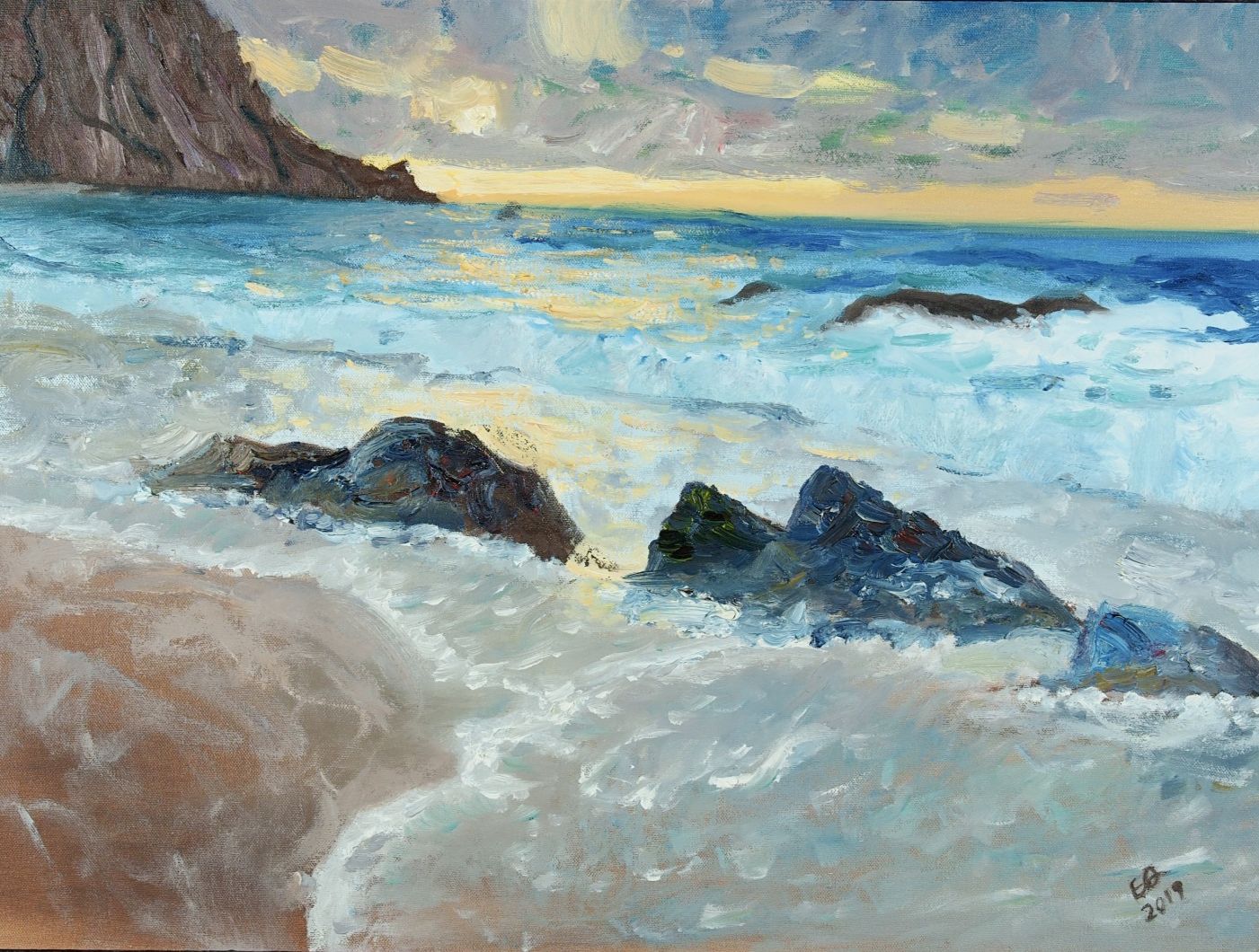 The oil painting, ”Once upon a Shore,” captures the essence of nature’s raw power and beauty. With its abstract strokes and contrasting colors, the artwork depicts rocks hitting the waves in a mesmerizing display. The artist skillfully uses cold hues to convey the energy and movement of the ocean.. The rough brushstrokes create a dynamic texture that mimics the crashing waves against the rocks. This technique adds depth to the artwork, allowing viewers to feel as if they are standing on that very shore, witnessing nature’s force firsthand. This painting is an invitation to view the humanity’s relationship with nature. It serves as a reminder of our vulnerability in front of natural forces while also celebrating their awe-inspiring beauty. The painting encourages us to appreciate our surroundings and respect our environment.