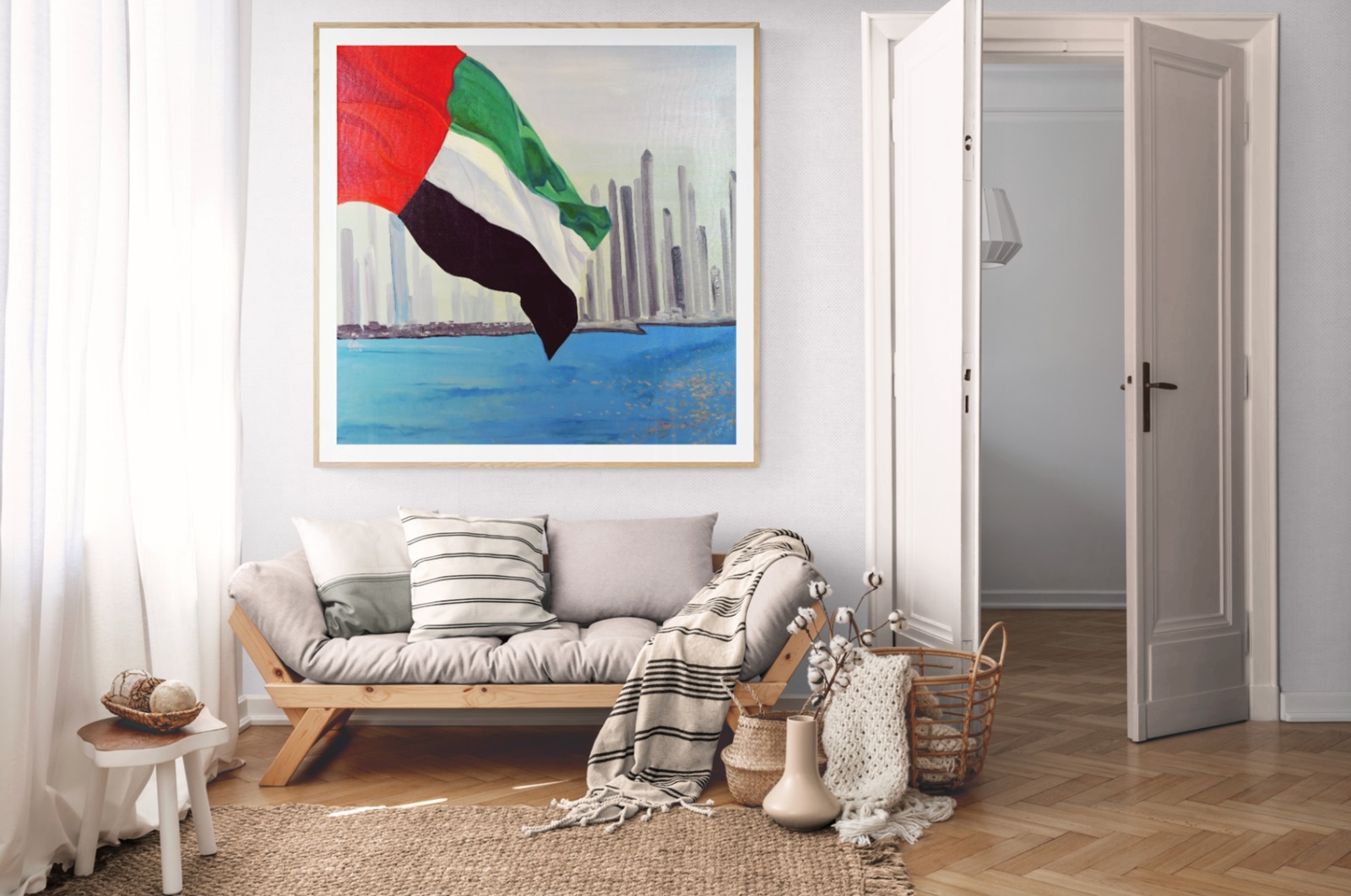 The UAE flag depicted in the oil painting serves as a symbol of national pride and unity. The flag of the United Arab Emirates features the Pan-Arab colors of red, green, white, and black, which are symbolic of Arab unity. The towering skyscrapers of Abu Dhabi in the background of the artwork reflect the rapid urbanization and development that the UAE has undergone in recent years. These skyscrapers represent the country’s ambition, innovation, and progress, as well as its determination to establish itself as a leading global business and tourism destination.