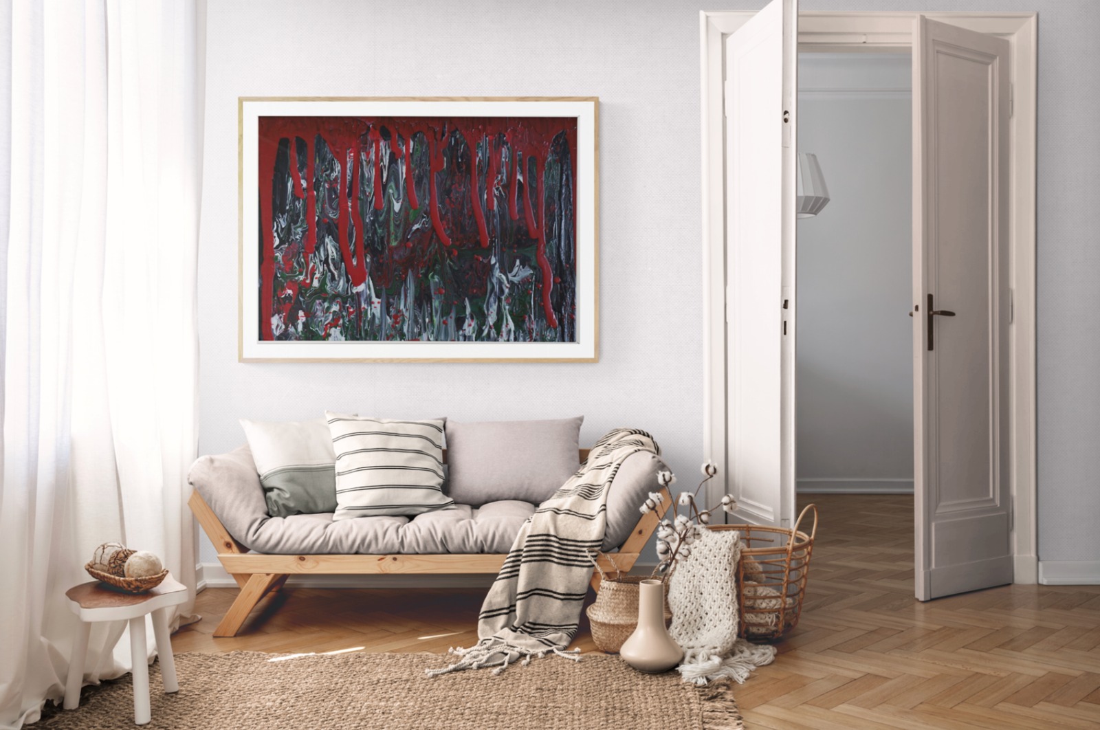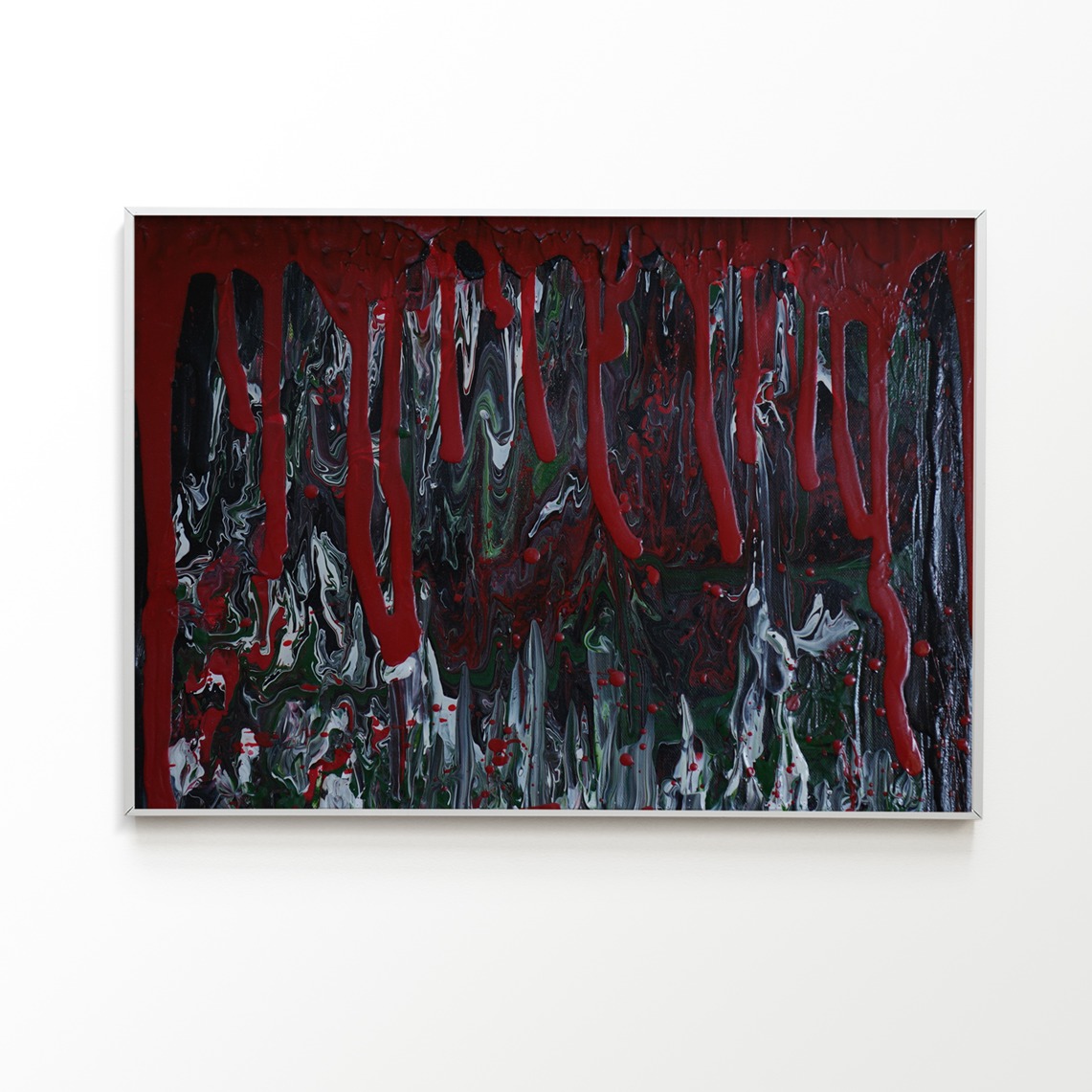 An abstract painting with the colors of the United Arab Emirates flag of white, green, and black in the background, with red color dripping from above, represents a powerful tribute to all the soldiers who have made the ultimate sacrifice for their country. This artwork encapsulates the profound emotions and deep gratitude felt towards those brave individuals who laid down their lives to defend the honor and integrity of their nation.