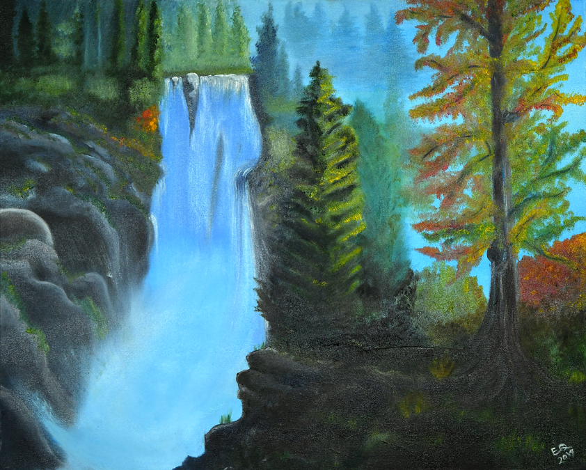 The Forest Waterfall in Autumn is an oil painting that captures the beauty of nature.