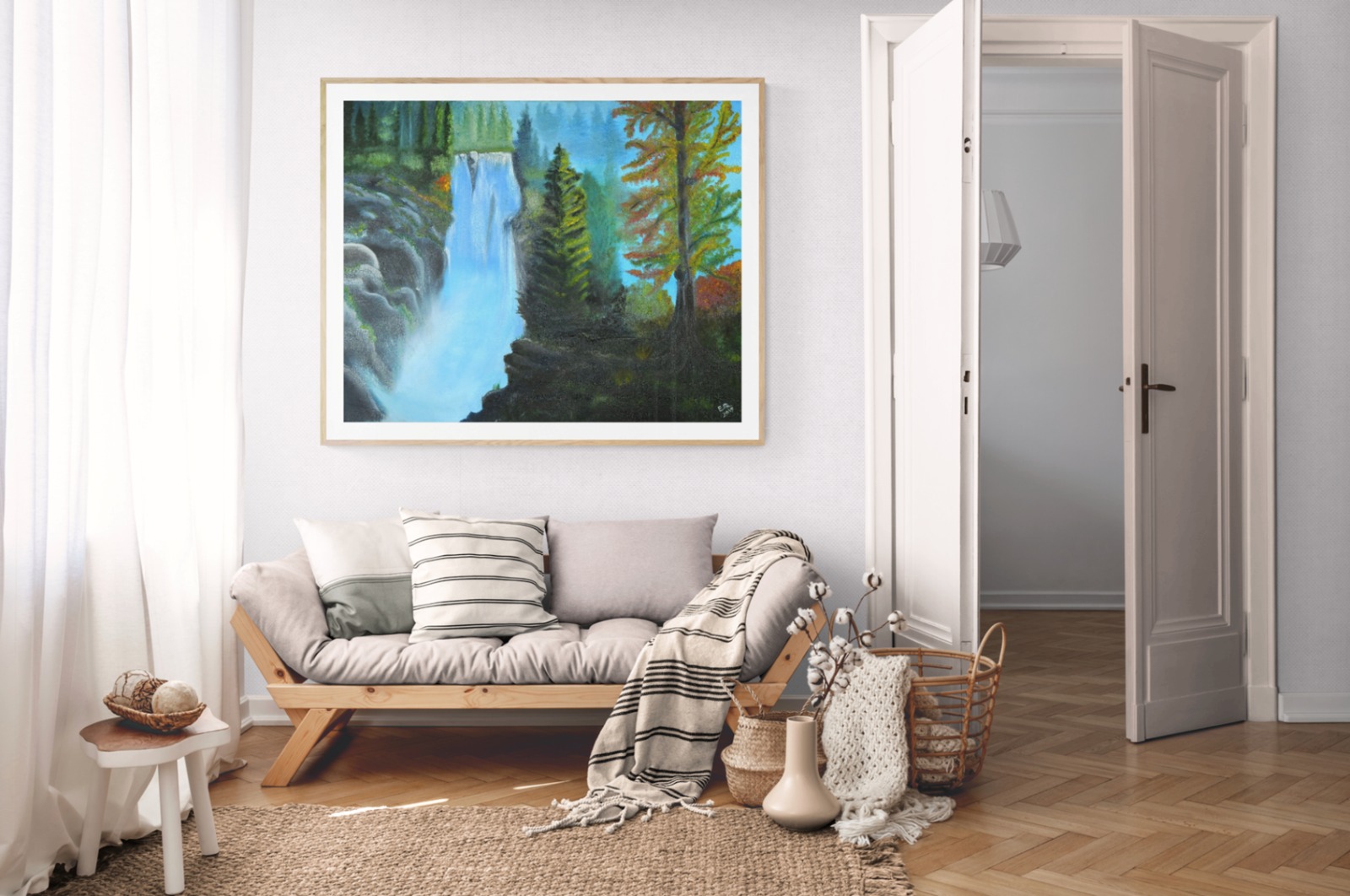 The Forest Waterfall in Autumn is an oil painting that captures the beauty of nature. Using the medium of oil paint, the artist skillfully a waterfall surrounded by a lush forest during the autumn season.The artwork portrays a sense of serenity and harmony, inviting viewers to immerse themselves in the peaceful ambience of a natural landscape. The use of oil paint in this artwork allows for rich, vibrant colors and a smooth, velvety texture that enhances the overall visual experience. Additionally, the choice of depicting a waterfall in a forest during autumn is significant. The artist has chosen a subject that resonates with the collective appreciation for the beauty of nature.