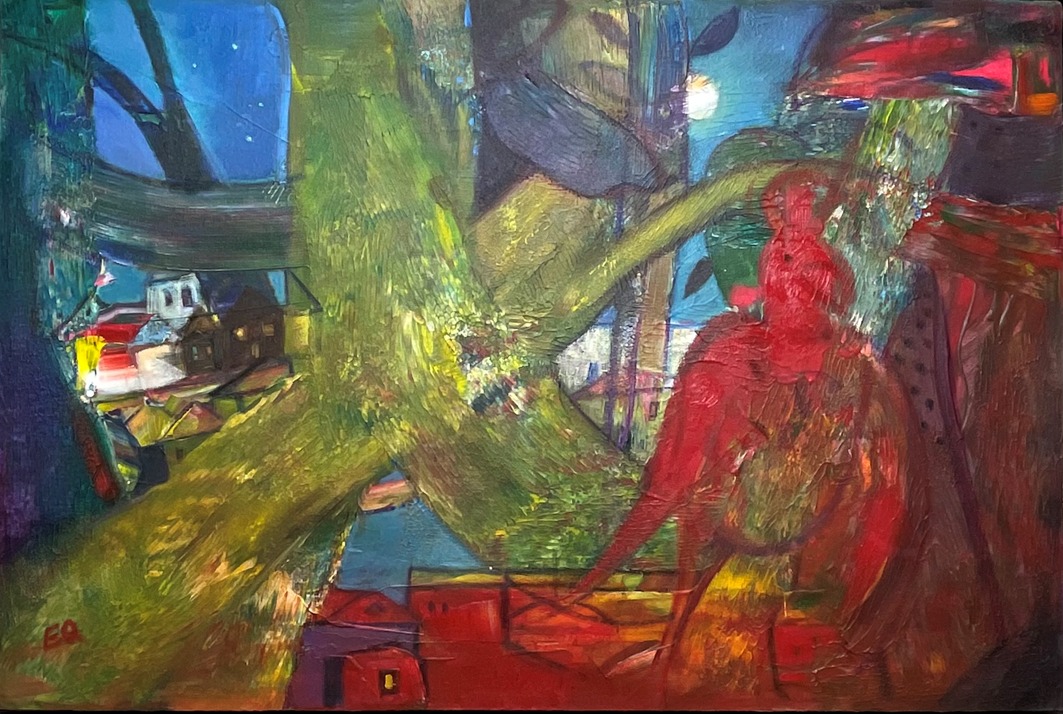 This captivating abstract oil painting explores a world of shapes, colors, and emotions, all brought to life on a 56cm x 82cm canvas. A vibrant red bird emerges as the central focus, its presence sparking curiosity and igniting the imagination.