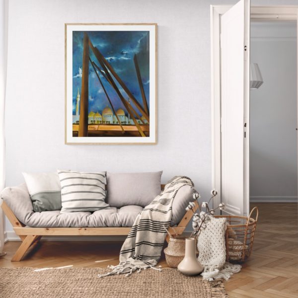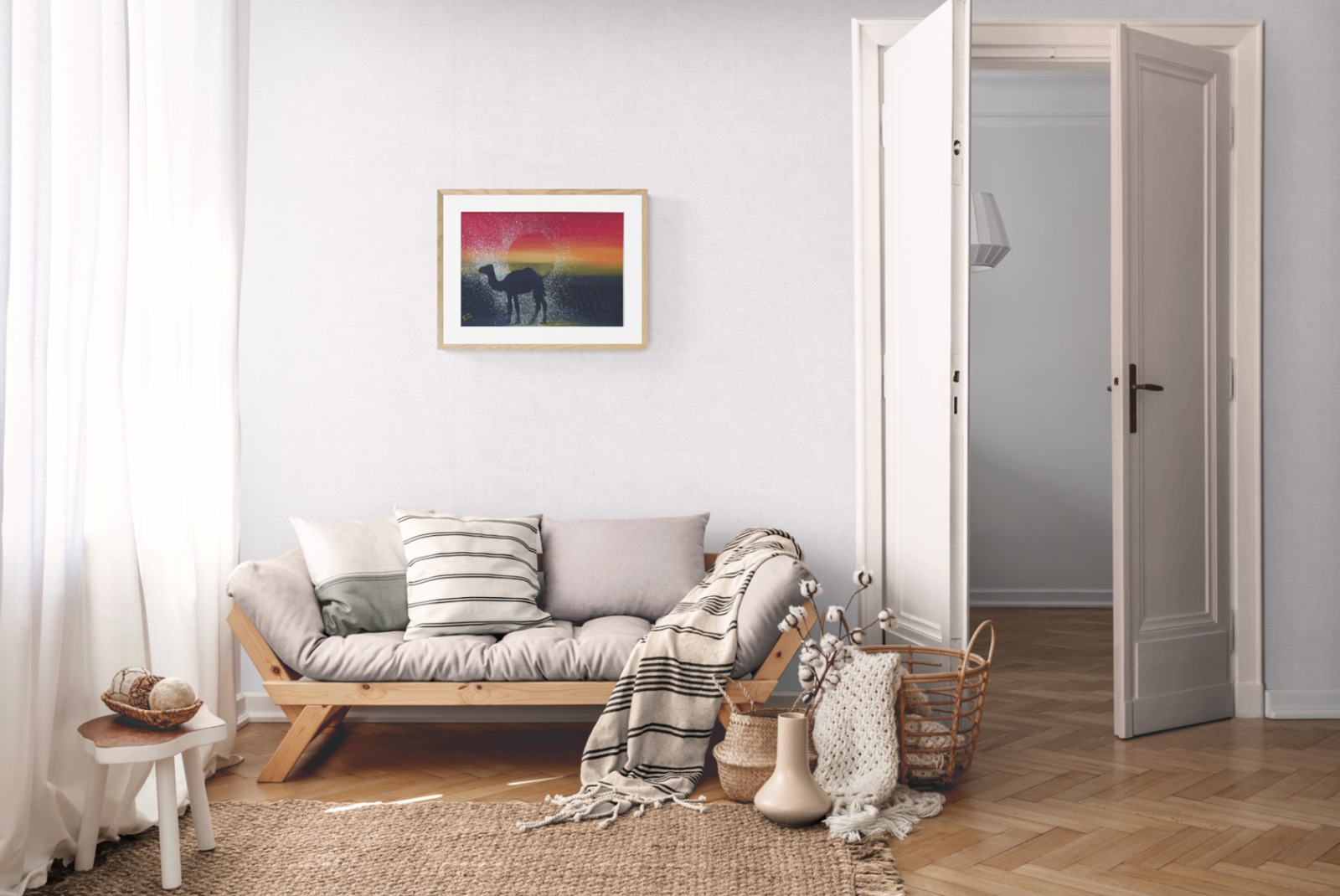 The black camel, with its strong and majestic presence, stands as a symbol of resilience and endurance. It represents the ability to navigate through life’s challenges with grace and strength. The sunset scene behind it adds depth to the painting, symbolizing the passage of time and the transient nature of existence. The warm hues of orange, red, and yellow create an atmosphere of tranquility and serenity.